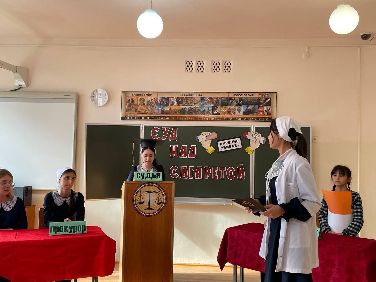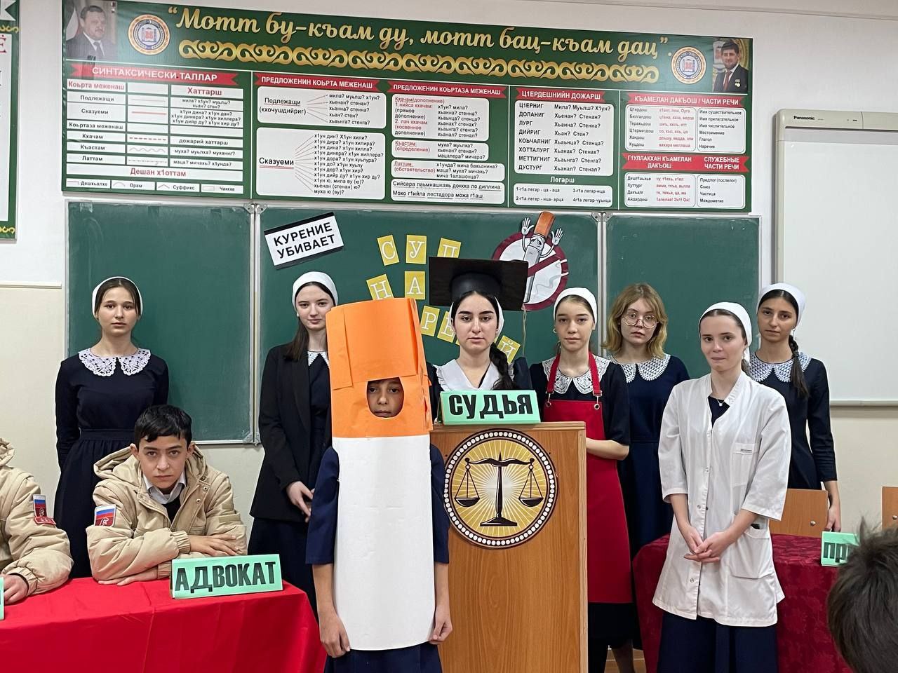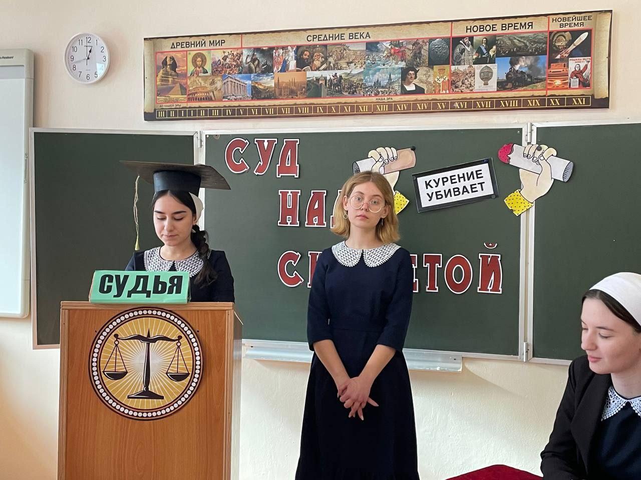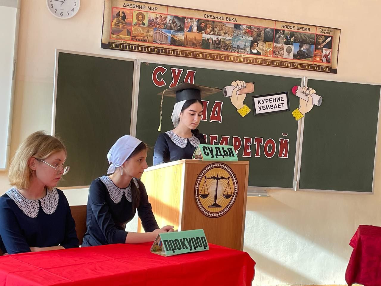 03.12.2022Наше школьное самоуправление совсем не знает отдыха. На этой неделе министром спорта и здоровья Алояровой М. и её командой было организовано тетрализованное представление с элементами игры «Суд над сигаретой». В ходе игры ребята вспомнили все негативные последствия курения. Вот только обвиняемая совсем не признавала свою вину и только твердила, что она не виновата . Однако неприклонный судья всё же вынес свой суровый приговор: "Изгнать сигарету из общества, а значит и из стен нашей школы " .