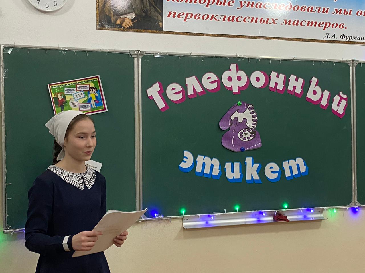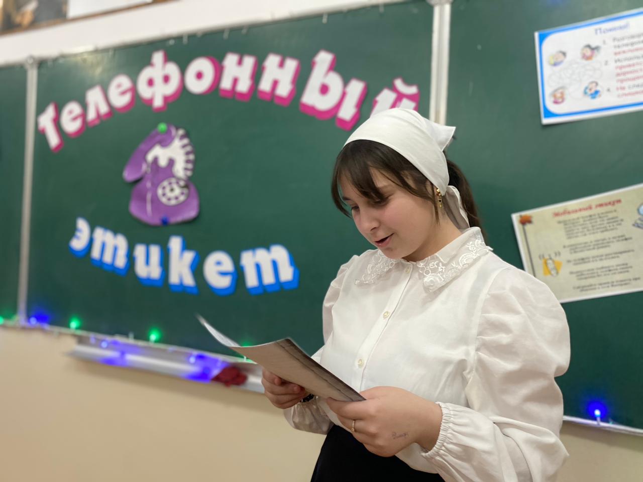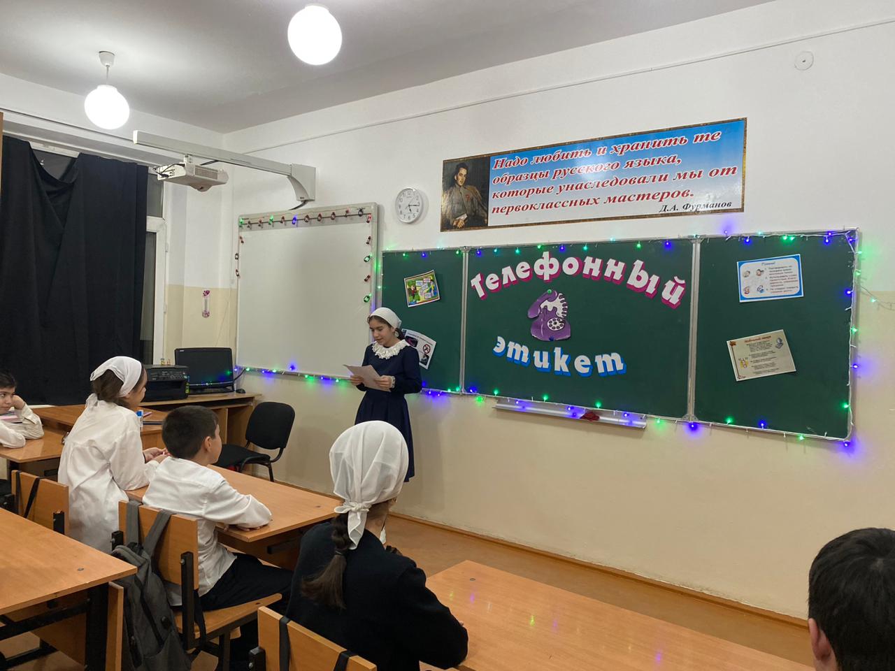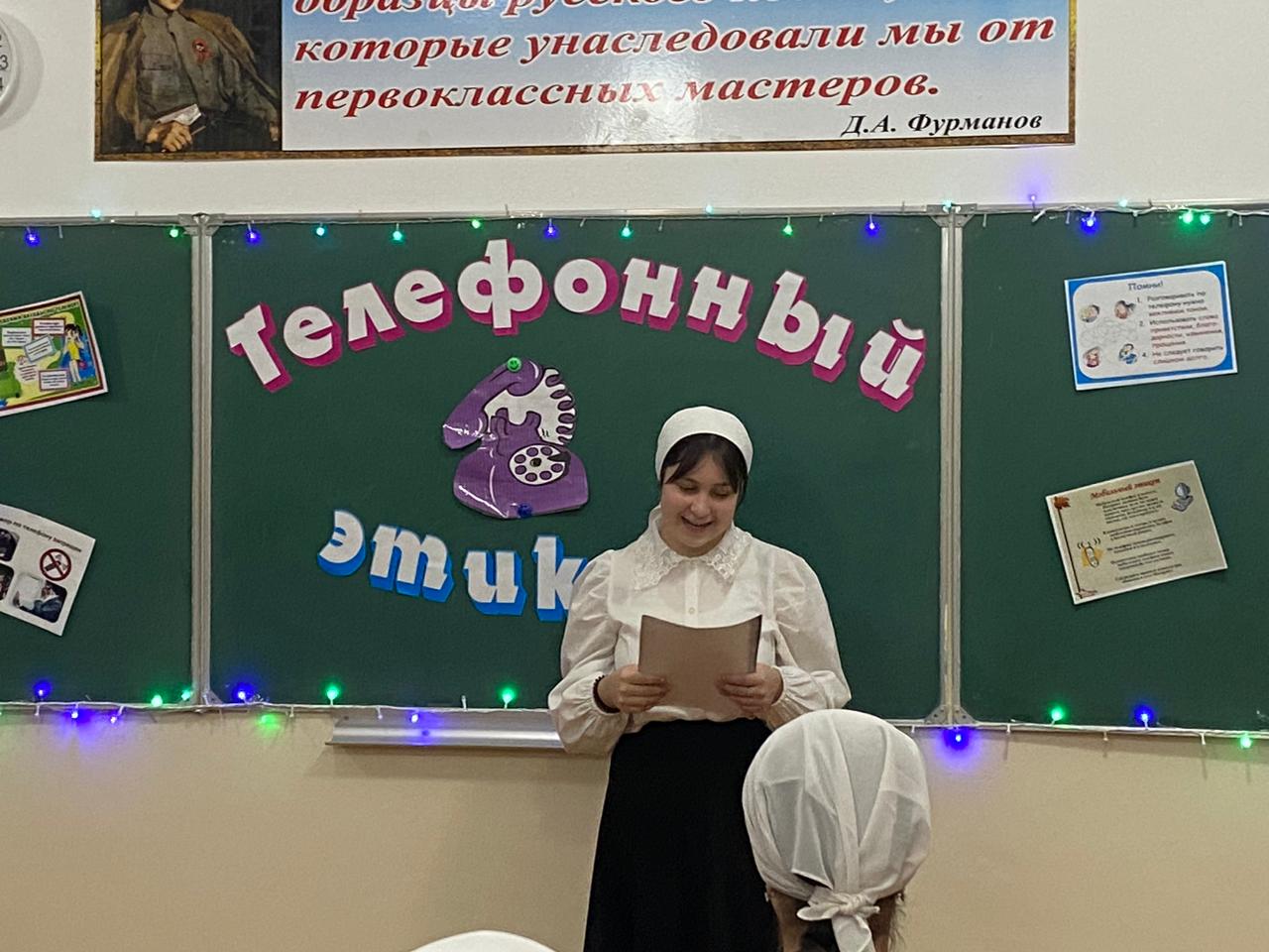 24.12.2022Доброй традицией стало участие в проведении старшеклассниками тематических классных часов в средних классах. 17 декабря в 7-г классе состоялся классный час на тему "Телефонный этикет". Обучающиеся 11-б класса лидер ЧРОО "ЕДИНАЯ ДЕТСКО-ЮНОШЕСКАЯ ОРГАНИЗАЦИЯ ЧЕЧЕНСКОЙ РЕСПУБЛИКИ" провела беседу о правилах общения по мобильной связи, обучающую викторину. С удовольствием ребята посмотрели мультяшные ролики о правилах мобильного этикета.